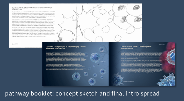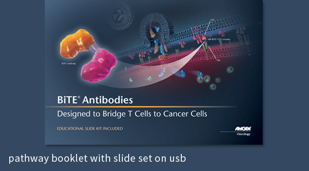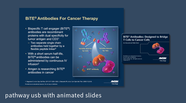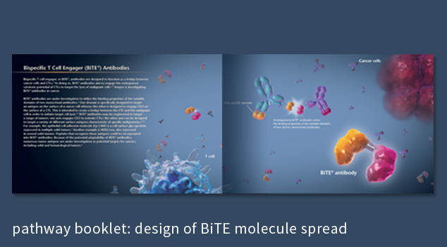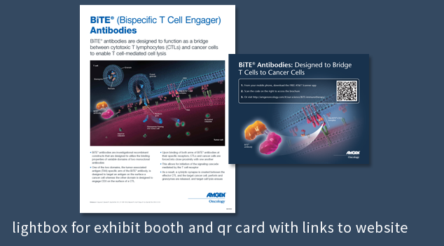An exciting potential for targeting cancer cells by white blood cells was the basis for the design of a mechanism booklet with interactive slides and lightbox panel. As creative lead, I worked with our internal and client team to develop the design of the molecules and the overall program. We worked on both static presentations of the mechanism of action of the molecules and interactive elements in slide presentation deck that was included on a USB drive attached to the mechanism of action booklet. I coordinated with Amgen and their exhibit and web vendors to provide artwork for their lightbox panel in the corporate booth and created a QR card that linked to their oncology website. The look of the imagery was very appealing to the team at Amgen: the president of the oncology division asked us to put together a slide presentation of the mechanism artwork for presentation to Amgen investors.