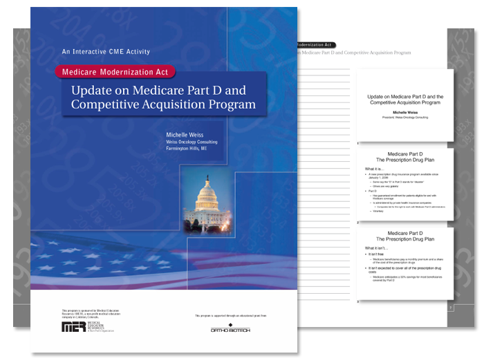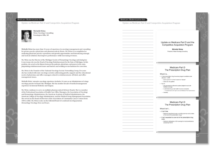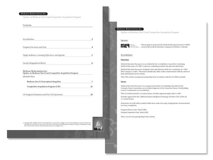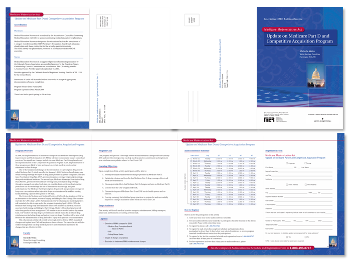 This online program provided educatation for Ortho Biotech customers on important changes in Medicare and how that might impact their patients. The components included the direct mail brochure that participants could select a convenient time to log in and a workbook available for the participants to follow the program, make notes, and take an assessment for continuing medical education credits upon completion. I created the color scheme, type treatments, the photo collage, and the layouts for both the direct mail brochure and the workbook.
