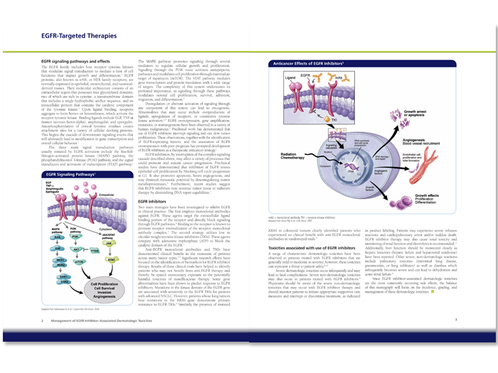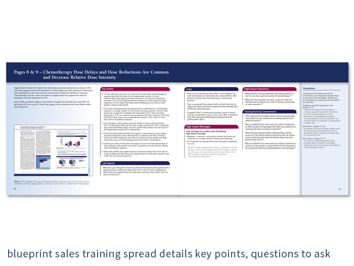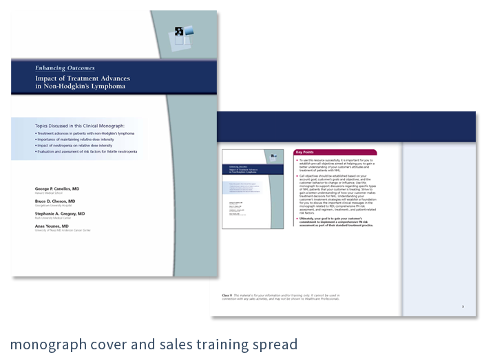 Our team at CREO was able to create a series of custom, combination monographs/detail aids for Amgen. These detail aid topics on the right pages were designed to facilitate discussions with customers on immune system complications with their patients with cancer. In addition, they were left behind with customers so they could read in depth on latest data on immune issues on the left pages which were structured as an educational monograph. The monograph/detail aids were created for different types of cancers: breast cancer, Non-Hodgkin's lymphoma, and lung cancer. In addition, we created sales training booklets that deconstructed each page and gave the sales reps best practices when engaging customers, questions they might ask, questions to pose, and the right side suggested next topics to pursue in the discussion. I developed the structure of the layouts, design styles of graphics, selected paper stocks, and supervised production and delivery. The client at Amgen was pleased with the quality and our mastery of the content. The success of the first 3 booklets recommended us to another product team and we developed a similar set of materials for the team working with egfr therapies.